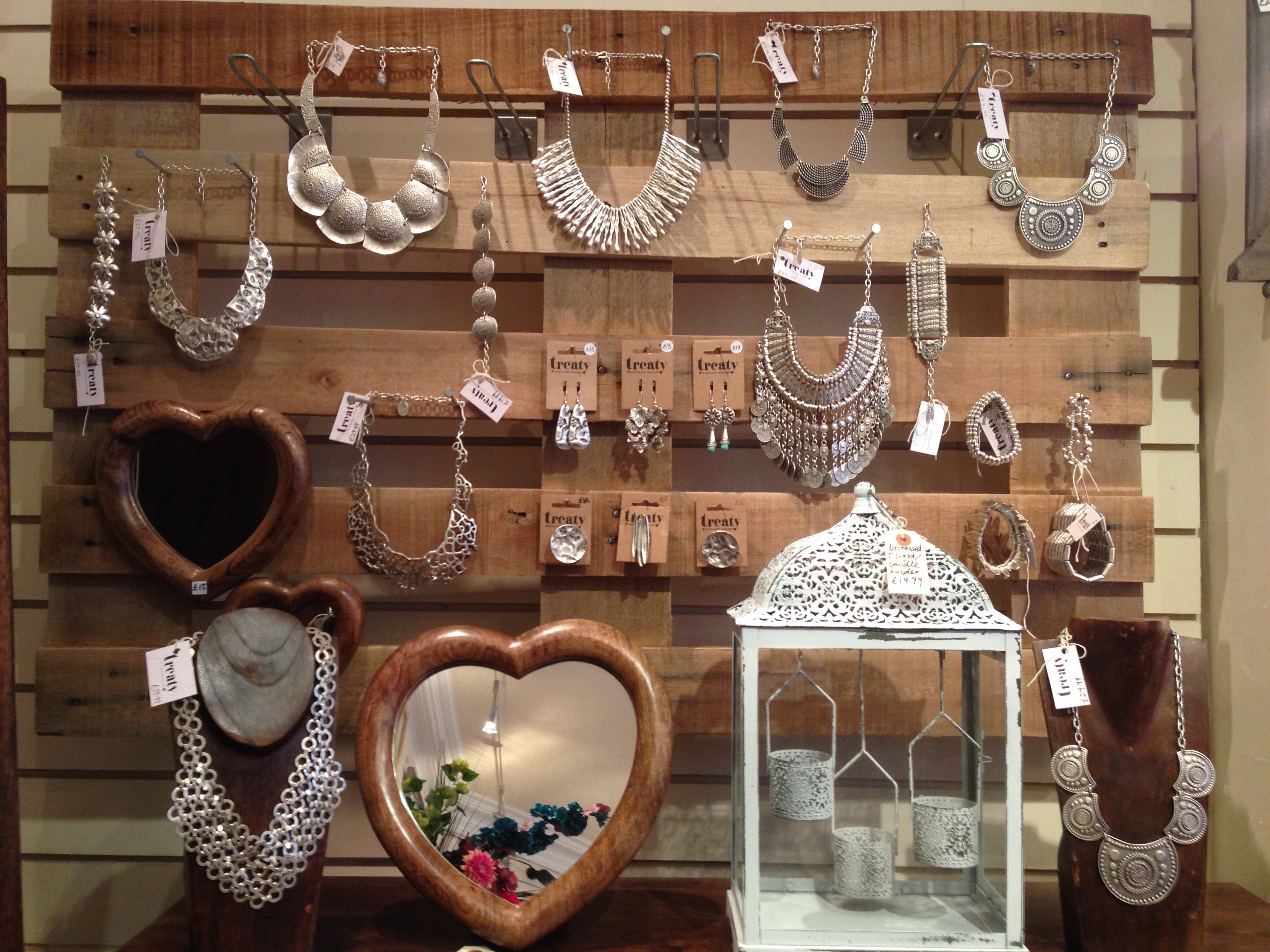 1. wooden jewellery holder : have a look at the picture below, we have turned a pallet into a jewellery holder and display our entire range of  Treaty jewellery on it. Guess how much the cost of this project is? ONLY £2.50, just to get some nails to hang the pallet on the wall !!!!